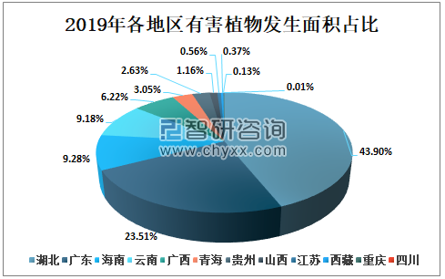 2019年湖北有害植物发生面积占全国有害植物发生面积的43.90%,广东有害植物发生面积占比为23.51%,海南有害植物发生面积占比为9.28%。