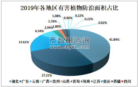 2019年湖北有害植物防治面积占全国有害植物防治面积的41.84%,广东有害植物防治面积占比为27.21%,云南有害植物防治面积占比为15.61%。