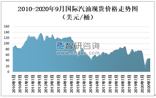 2010-2020年9月国际汽油现货价格走势图(美元/桶)