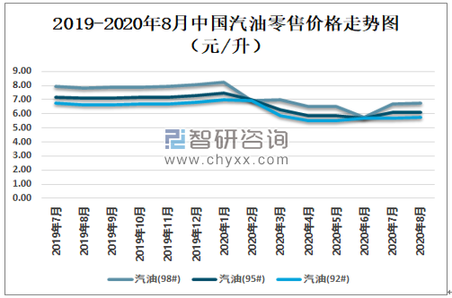 2019-2020年8月中国汽油零售价格走势图(元/升)
