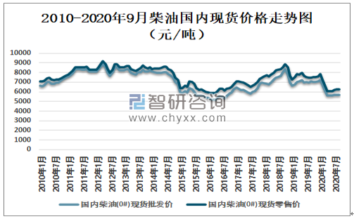 2020年9月国内柴油(0#)现货批发价 为5653.75元/吨,较2020年1月减少了1541.75元/吨;国内柴油(0#)现货零售价为6247元/吨,较2020年1月减少了1594.25元/吨。