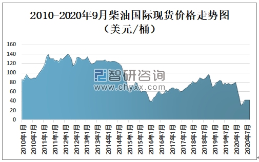 2010-2020年9月柴油国际现货价格走势图(美元/桶)