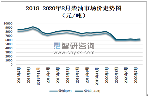 2020年8月柴油(0#)市场价为6031.12元/吨,较2020年1月减少了1679.11元/吨;柴油(-10#)市场价为6279.69元/吨,较2020年1月减少了1905.31元/吨。