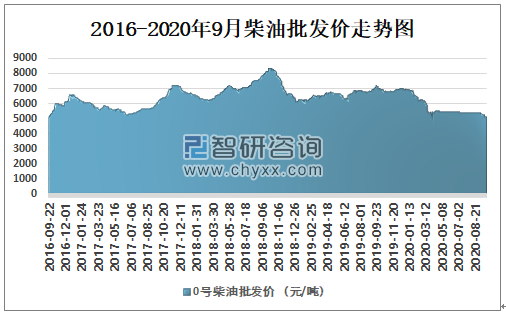 2010-2020年9月柴油国内现货价格走势图(元/吨)