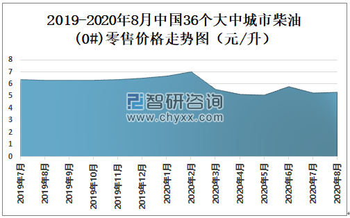 2019-2020年8月中国36个大中城市柴油(0#)零售价格走势图(元/升)