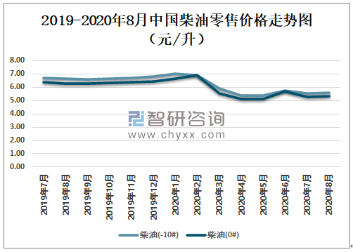 2020年8月柴油(-10#)零售价格为5.57元/升,较2020年1月减少了1.43元/升;柴油(0#)零售价格为5.31元/升,较2020年1月减少了1.30元/升。