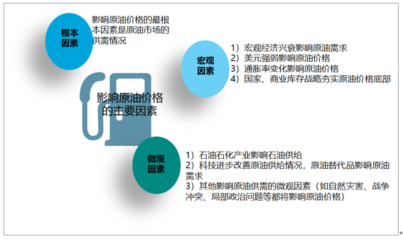 影响原油价格的最根本因素是原油市场的供需情况。影响原油价格的主要宏观因素有:1)宏观经济兴衰影响原油需求。2)美元强弱影响原油价格。3)通胀率变化影响原油价格。4)国家、商业库存战略夯实原油价格底部。影响原油价格的主要微观因素有:1)石油石化产业影响石油供给。2)科技进步改善原油供给情况,原油替代品影响原油需求。3)其他影响原油供需的微观因素。