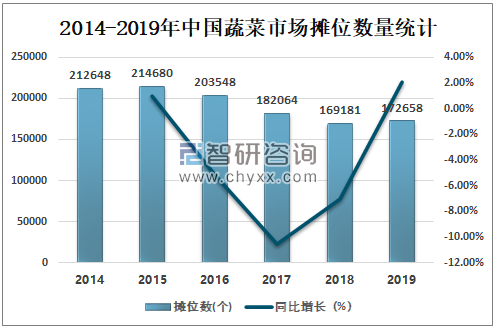 2014-2018年中国蔬菜市场摊位数量逐年减少,2018年中国蔬菜市场共有摊位169181个,较2017年减少了12883个,2019年较2018年有所增长,2019年中国蔬菜市场共有摊位172658个,较2018年增加了3477个。