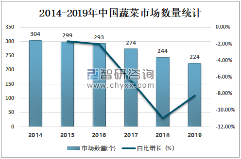 当前我国城市化速度明显加快,各大中城市对城市建设十分重视,而落后的赃、乱、差的蔬菜市场显然对整个城市的发展拖了后腿。随着消费习惯和生活方式的转变,在经济发达的地区或城市传统蔬菜市场将逐步退出市场舞台。近年来中国蔬菜市场数量逐年减少,2018年中国共有蔬菜市场244个,较2017年减少了30个;2019年中国共有蔬菜市场224个,较2018年减少了20个。