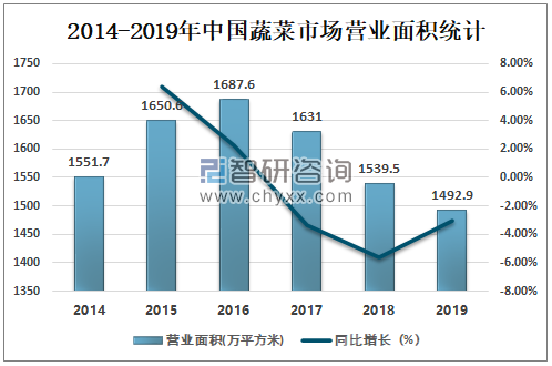 智研咨询发布的《2021-2027年中国蔬菜行业市场供需规模及投资前景预测报告》显示;近年来随着城市化进程加快,中国蔬菜市场营业面积逐年减少,2018年中国蔬菜市场营业面积为1539.5万平方米,较2017年减少了92万平方米;2019年中国蔬菜市场营业面积为1492.9万平方米,较2018年减少了47万平方米。