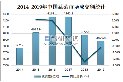 随着中国蔬菜市场数量的减少,中国蔬菜市场成交额也随之减少,2018年中国蔬菜市场成交额为3972.3亿元,同比减少6.80%;2019年中国蔬菜市场成交额为3879.8亿元,同比减少2.33%。