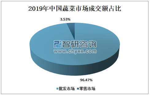 2019年中国蔬菜批发市场成交额占总成交额的96.47%,是中国蔬菜市场成交额的主要来源,蔬菜零售市场成交额仅占总成交额的3.53%,占很少一部分。