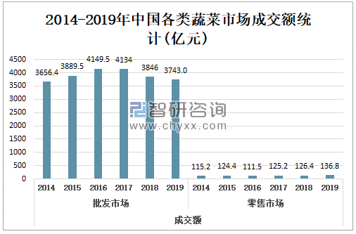 2019年中国蔬菜批发市场成交额为3743亿元,较2018年减少了103亿元;蔬菜零售市场成交额为136.8亿元,较2018年减少了10.4亿元。