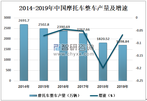 经过起步、发展、整合、重组,风雨兼程、跌宕起伏的艰难历程,经过摩托车工业战线的努力拼搏,中国现已跻身世界摩托车生产大国。2014-2019年中国摩托车整车产量有所下降,2019年中国摩托车整车产量1698.84万辆,较上年减少121.68万辆,同比下降6.68%。