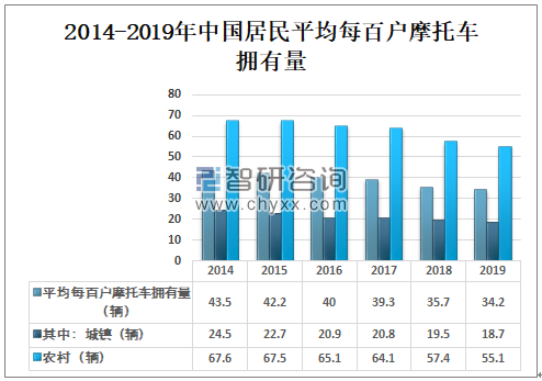 国内摩托车市场呈现出的是一种下滑势头,我国农村市场是摩托车消费的主力市场。2019年中国居民平均每百户摩托车拥有量为34.2辆,其中城镇居民平均每百户摩托车拥有量为18.7辆,农村居民平均每百户摩托车拥有量 55.1辆。