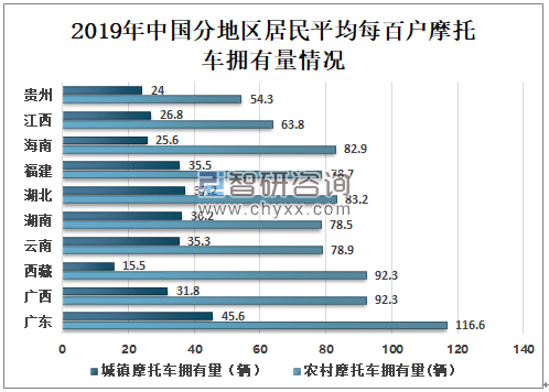 智研咨询发布的《2021-2027年中国摩托车行业市场研究分析及投资决策建议报告》数据显示:2019年我国居民年末摩托车拥有量平均每百户为34.2辆;其中广东、广西、西藏等城市、居民年末摩托车拥有量平均每百户分别为66.4、63.8、61.9辆。