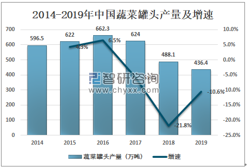 蔬菜产业在我国农业经济中占有重要地位,作为蔬菜产业的重要组成部分,蔬菜加工业已经成为我国蔬菜产业实现可持续发展的重要保障力量。2019年中国蔬菜罐头产量为436.4万吨,同比下降10.6%。