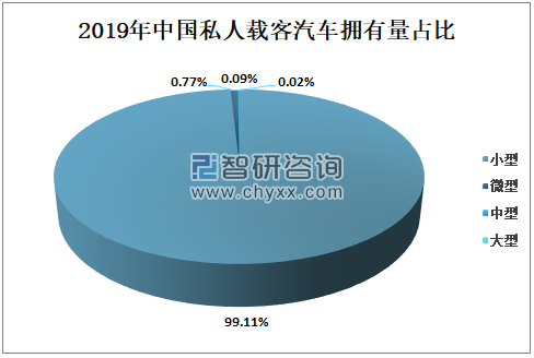 2019年中国私人载客汽车拥有量20710.58万辆,其中小型汽车拥有量20527.27万辆,占私人载客汽车拥有量的99.11%;微型汽车拥有量160.11万辆,占私人载客汽车拥有量的0.77%;中型汽车拥有量18.99万辆,占私人载客汽车拥有量的0.09%;大型汽车拥有量4.21万辆,占私人载客汽车拥有量的0.02。