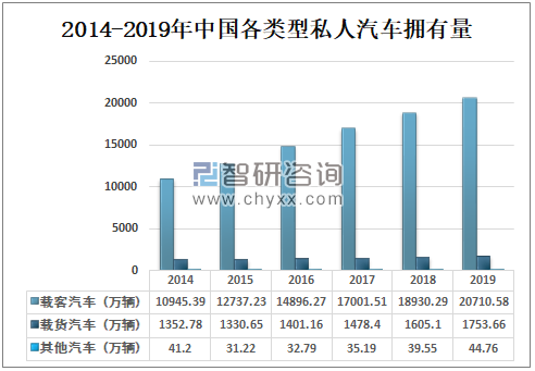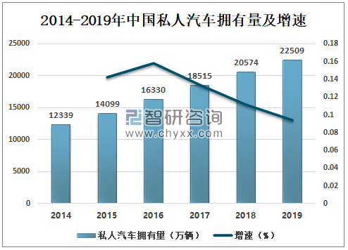 随着我国经济突飞猛进的发展,人民群众的收入水平不断提高,私人汽车拥有量不断增加,同时银行的按揭贷款买车等等的一系列推动措施,也促进了私人汽车拥有量的增加。2014-2019年中国私人汽车拥有量逐年增长,2019年中国私人汽车拥有量22509万辆,较上年增加1935万辆,同比增长9.4%。