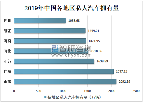 分省市来看,2019年我国私人汽车拥有量最多的省市为山东省,私人汽车拥有量达2092.39万辆。除山东省外,我国私人汽车拥有量超过千万辆的省市还有6个,依次为广东、江苏、河北、河南、浙江及四川,私人汽车拥有量分别是2037.15、1639.89、1518.86、1471.95、1459.21、1058.68万辆。