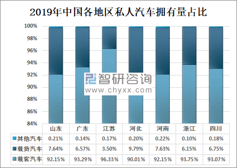2019年山东省私人载客汽车拥有量1928.17万辆,占私人汽车拥有量的92.15%,私人载货汽车拥有量159.95万辆,占私人汽车拥有量的7.64%;广东省私人载客汽车拥有量1900.63万辆,占私人汽车拥有量的93.29%,私人载货汽车拥有量133.86万辆,占私人汽车拥有量的6.57%。