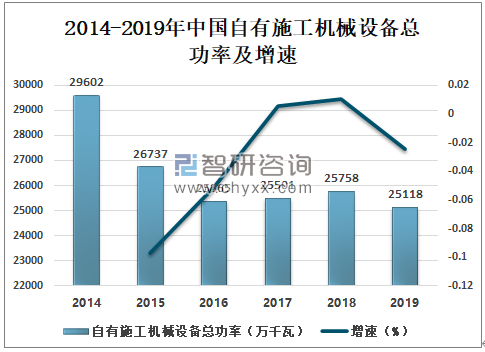 2014-2019年中国自有施工机械设备总功率及增速