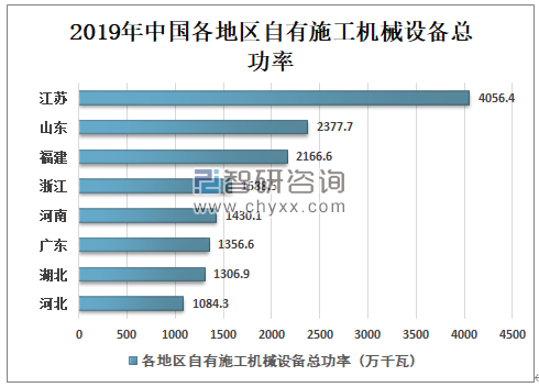 2019年江苏省自有施工机械设备总功率为4056.4万千瓦,居全国第一;其次是山东、福建、浙江等地,自有施工机械设备总功率分别是2344.7、2166.6、1588.5万千瓦;其余各地自有施工机械设备总功率均在1000万千瓦以上。