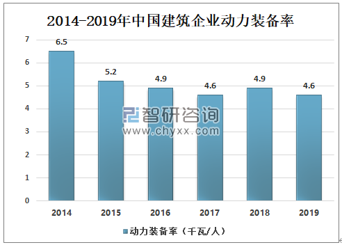 动力装备率,是指年末建筑业企业自有机械设备总功率与年末全部员工人数的比值。2014-2019年中国建筑企业动力装备率总体保持下降趋势,2018年中国建筑企业动力装备率为4.9千瓦/人;2019年中国建筑企业动力装备率为4.6千瓦/人。