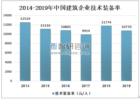 技术装备率,是指年末建筑业企业自有机械设备净值与年末全部员工人数的比值。2014-2019年中国建筑企业技术装备率呈波动发展,2018年中国建筑企业技术装备率为11774元/人;2019年中国建筑企业技术装备率10770元/人。