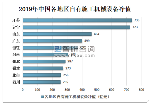 2019年江苏省自有施工机械设备净值为735亿元,居全国第一;其次辽宁省自有施工机械设备净值为723亿元,排名第二;山东、广东、浙江、河南等地自有施工机械设备净值分别是464、399、370、306亿元。