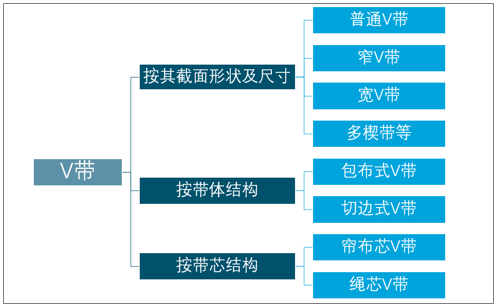V带按截面形状及尺寸可分为普通V带、窄V带、宽V带、多楔带等;按带体结构可分为包布式V带和切边式V带;按带芯结构可分为帘布芯V带和绳芯V带。