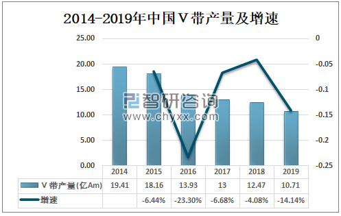 智研咨询发布的《2021-2027年中国V带行业发展现状调查及投资战略规划报告》数据显示:2014-2019年中国V带产量逐年下降,根据中国橡胶工业协会数据显示:2019年中国V带产量为10.71亿AM,较2018年减少了1.76亿AM,同比下降14.14%。
