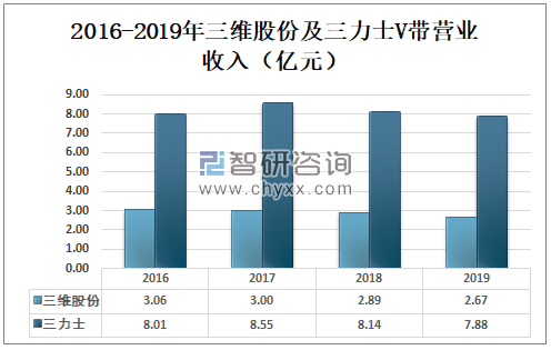 2019年三维股份V带营业收入为2.67亿元,较2018年减少了0.22亿元;2019年三力士V带营业收入为7.88亿元,较2018年减少了0.26亿元。