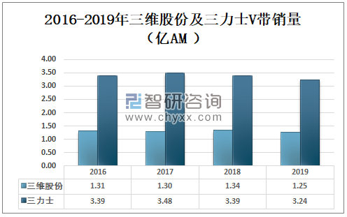 2019年三维股份V带销量为1.25亿AM,较2018年减少了0.9亿AM;2019年三力士V带销量为3.24亿AM,较2018年减少了0.15亿AM。
