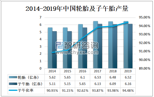 智研咨询发布的《2021-2027年中国子午线轮胎产业发展动态及前景战略分析报告》数据显示:2018年中国轮胎产量为6.48亿条,其中子午胎产量为6.09亿条,子午化率为93.98%;2019年中国轮胎产量为6.52亿条,其中子午胎产量为6.16亿条,子午化率为94.48%。