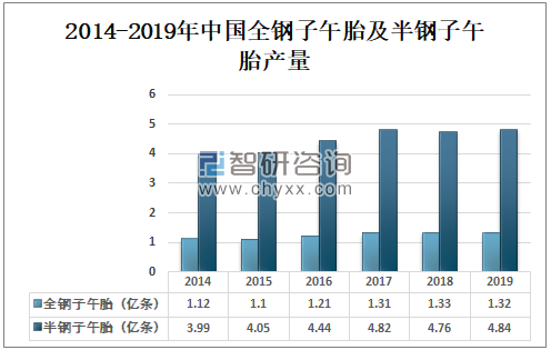 2019年全钢子午胎产量为1.32亿条,较2018年减少了0.01亿条;2019年半钢子午胎产量为4.84亿条,较2018年增加了0.08亿条。
