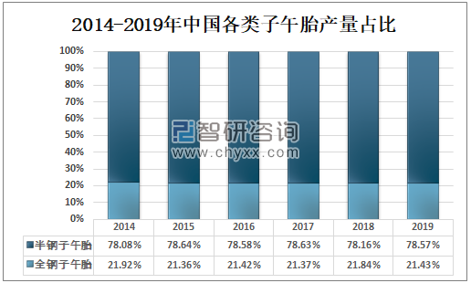 半钢子午胎产量占比较大,2019年全钢子午胎产量占子午胎总产量的21.43%,半钢子午胎产量占子午胎总产量的78.57%。