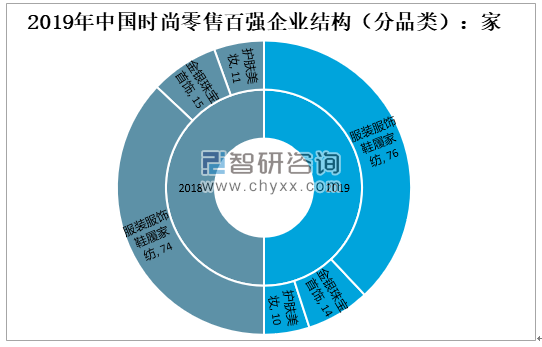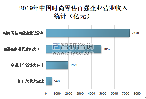 2020年6月9日中国连锁经营协会发布2019-2020年中国时尚零售企业百强榜(简称2019时尚零售百强),榜单显示,2019年百强总营收7328.40亿元,其中服装服饰鞋履家纺类企业总营收4852.02亿元;金银珠宝首饰类企业总营收1928.15亿元;护肤美妆类企业总营收548.22亿元,护肤美妆类企业总营收大幅下降的主因为上年上榜的百雀羚和上美集团两家龙头企业因未披露2019年营收而未被录入榜单。