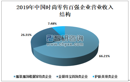智研咨询发布的《2021-2027年中国时尚零售行业发展战略规划及投资方向研究报告》数据显示:2019年中国时尚零售百强企业榜单中服装服饰鞋履家纺类企业营业收入占总营业收入的66.21%,占比最大;金银珠宝首饰类企业营业收入占总营业收入的26.31%;护肤美妆类企业营业收入占总营业收入的7.48%。