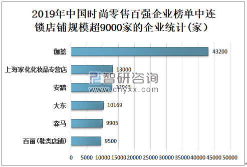 2019年中国时尚零售百强企业榜单中,连锁店铺规模超9000家的企业有6家,其中伽蓝43200家;上海家化化妆品专营店约13000家;安踏12943家;大东10169家;森马9905家;百丽、鞋类店铺9500家。