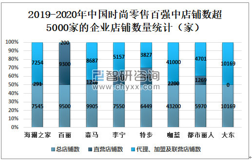 截止2020年6月9日海澜之家股份有限公司共有店铺7545家,其中直营店铺291家,加盟及联营店铺数7254家;百丽国际集团共有店铺9500家,其中直营店铺9300家,加盟及联营店铺数200家;浙江森马服饰股份有限公司共有店铺9905家,其中直营店铺1218家,加盟及联营店铺数8687家;李宁有限公司共有店铺7550家,其中直营店铺2393家,加盟及联营店铺数5157家;特步国际控股有限公司共有店铺6449家,其中直营店铺2622家,加盟及联营店铺数3827家;咖蓝〔集团)股份有限公司共有店铺43200家,其中直营店铺2200家,加盟及联营店铺数41000家;都市丽人(中国)控股有限公司共有店铺5970家,其中直营店铺1269家,加盟及联营店铺数4701家;浙江大东鞋业有限公司共有店铺10169家,其中直营店铺0家,加盟及联营店铺数10169家。