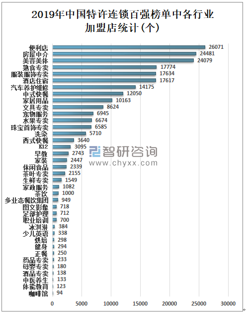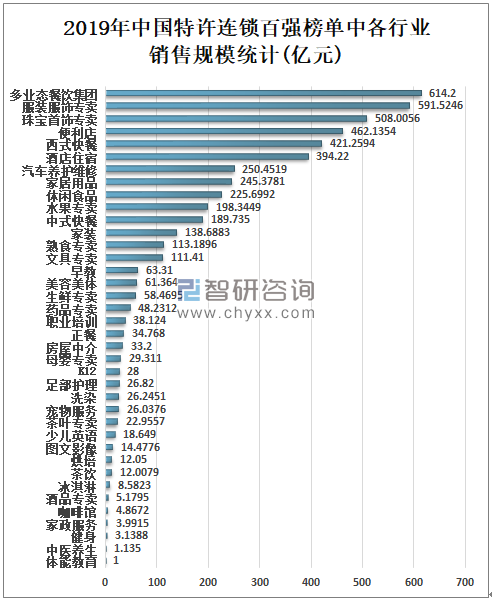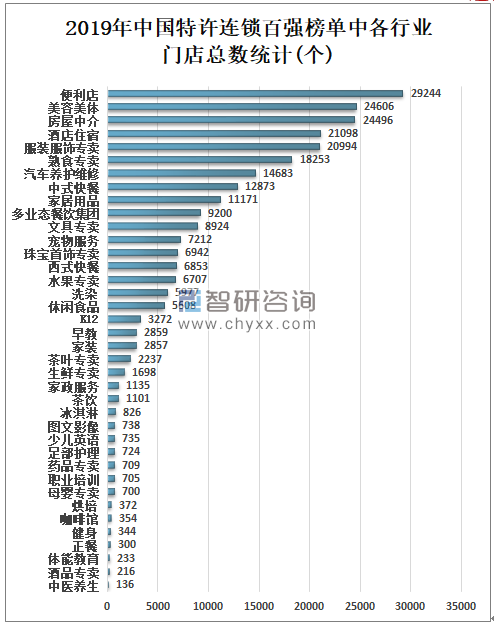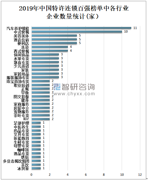 2020年7月8日中国连锁经营协会发布2019年中国特许连锁百强榜单,榜单显示,2019年中国汽车养护维修行业、中式快餐行业和便利店行业上榜排名全三,2019年中国汽车养护维修行业共有11家企业上榜,是上榜企业最多的行业;中式快餐行业共有10家企业上榜;便利店行业共有5家企业上榜;酒店住宿行业共有5家企业上榜;美容美体行业共有5家企业上榜;西式快餐行业共有4家企业上榜;洗染行业共有4家企业上榜;服装服饰专卖行业3家企业上榜。