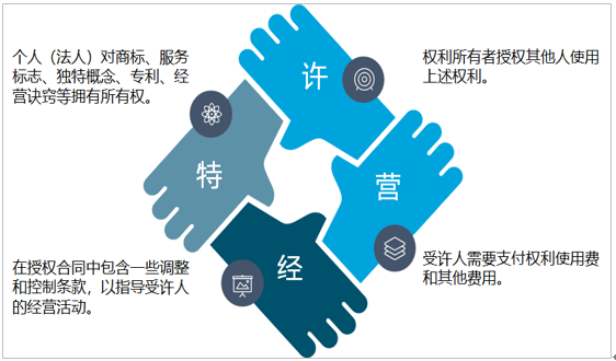 中国政府对特许经营的法律定义:特许经营指特许者将自己所拥有的商标(包括服务商标)、商号、产品、专利和专有技术、经营模式等以特许经营合同的形式授予被特许者使用,被特许者按合同规定,在特许者统一的业务模式下从事经营活动,并向特许者支付相应的费用。