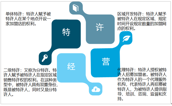 特许经营的类型主要有单体特许、区域开发特许、二级特许和代理特许。