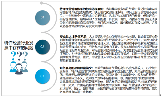 目前特许经营行业发展中存在的问题主要有:特许经营管理体系的标准化程度低、专业性人才队伍不足、知名度高的品牌数量偏少等。