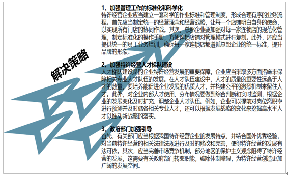 面对目前特许经营行业发展中存在的问题,解决策略主要有:加强管理工作的标准化和科学化、加强特许经营人才梯队建设、政府部门加强引导等。
