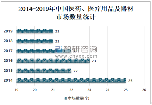 2016-2018年中国医药、医疗用品及器材市场数量逐年减少,2018年中国共有医药、医疗用品及器材市场21个,较2017年减少1个,2019年与2018年持平。