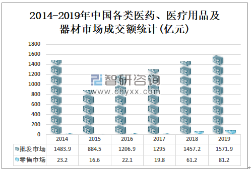 2019年中国医药、医疗用品及器材批发市场成交额为1571.9亿元,较2018年增长了114.7亿元;医药、医疗用品及器材零售市场交额为81.2亿元,较2018年增长了20亿元。