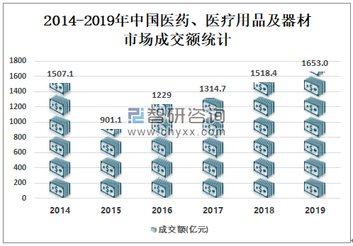 近年来中国医药、医疗用品及器材市场成交额逐年增加,2018年中国医药、医疗用品及器材市场成交额为1518.4亿元,同比增长15.49%;2019年中国医药、医疗用品及器材市场成交额达1653亿元,同比增长8.86%。