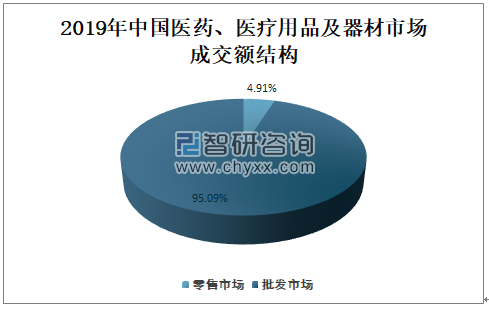2019年中国医药、医疗用品及器材批发市场成交额占总成交额的95.09%,占比非常大,是中国医药、医疗用品及器材市场成交额的主要来源;2019年中国医药、医疗用品及器材零售市场成交额占总成交额的4.91%,占比较小。